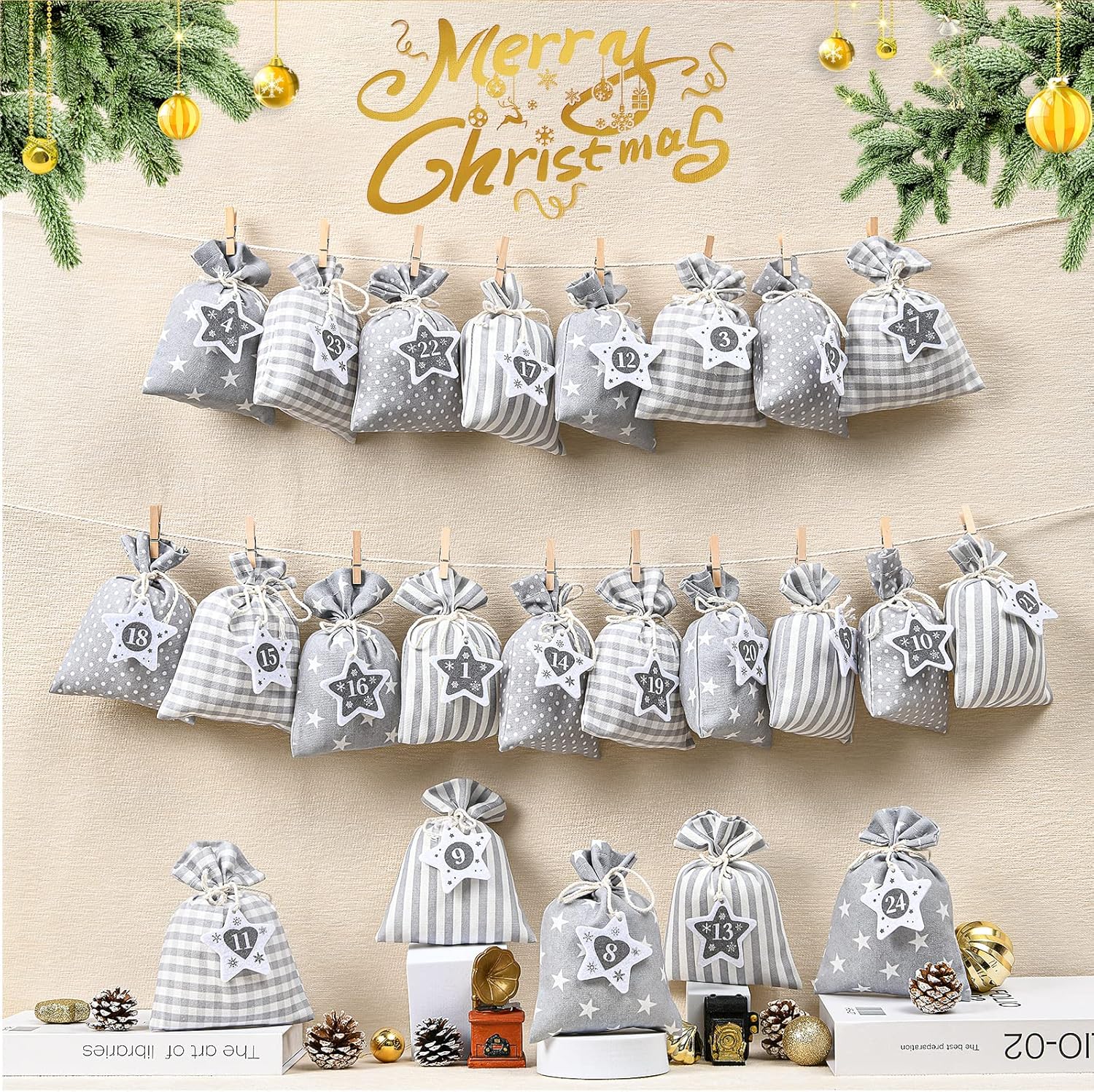 Die Geschenksäckchen in Grau- und Weißtönen fügen sich harmonisch in jede Weihnachtsdeko ein. Mit nummerierten Sternanhängern markierst du jeden Tag bis Heiligabend. Dank robuster Stoffe kannst du die Beutel Jahr für Jahr wiederverwenden und so eine nachhaltige Weihnachtstradition schaffen.