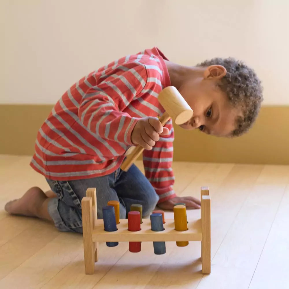 Durch das Klopfen der Stifte in die Löcher wird die Hand-Augen-Koordination und die Feinmotorik der Kinder spielerisch entwickelt.