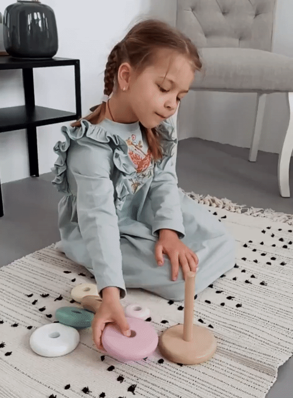 Bunte Stapelringe in verschiedenen Größen ermöglichen es deinem Kind, seine Feinmotorik und Hand-Augen-Koordination zu verbessern. Indem es die Ringe aufeinanderstapelt, erlernt es wichtige Fähigkeiten. Darunter Ursache-Wirkung-Beziehungen und das Verständnis von Farben, Größen und Reihenfolge.